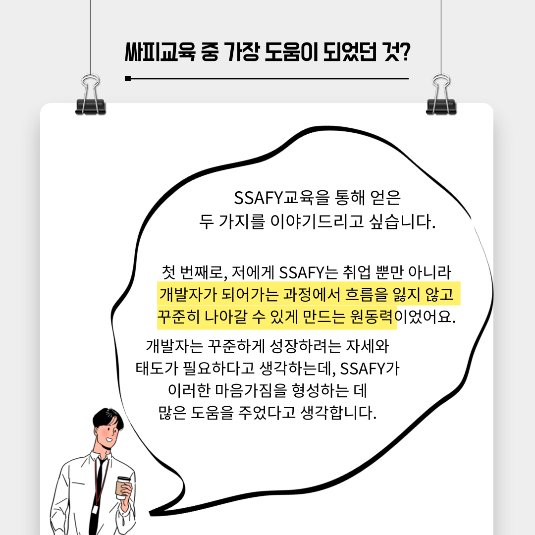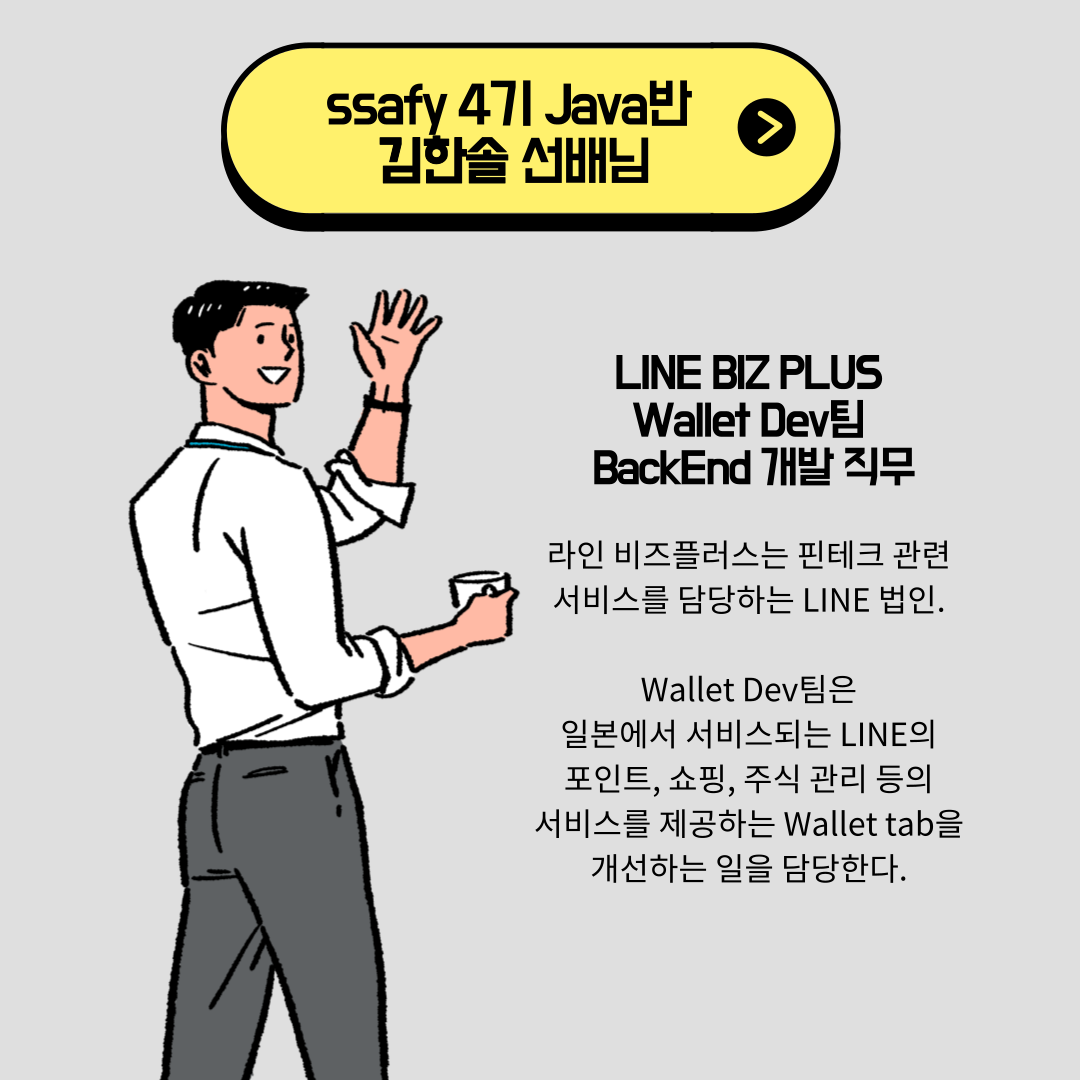 싸피 4기를 수료하고, 현재 라인 비즈플러스의 Wallet Dev팀에서 근무하고 계신